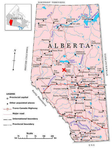 390 km north-west of Red Deer